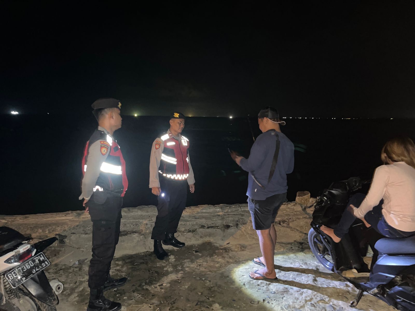 Patroli dilanjutkan ke kawasan Dermaga Bom Kalianda. Di lokasi tersebut, personel kepolisian menyampaikan imbauan kepada masyarakat yang sedang beraktivitas, khususnya warga yang memancing, agar selalu memperhatikan kondisi pasang surut air laut demi keselamatan.