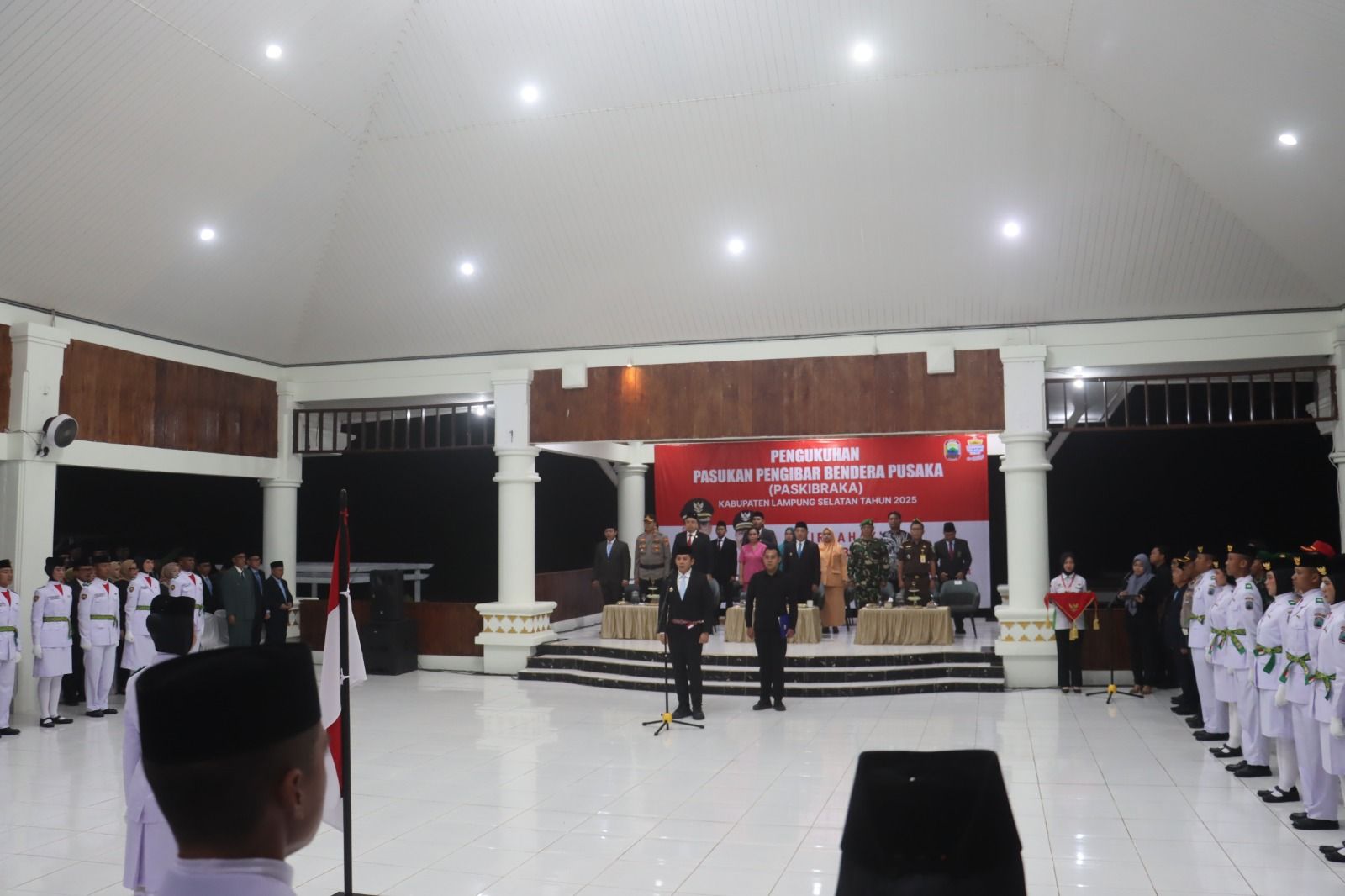 Lampung Selatan – Sebanyak 41 anggota Pasukan Pengibar Bendera Pusaka (Paskibraka) Kabupaten Lampung Selatan Tahun 2025 resmi dikukuhkan oleh Bupati Radityo Egi Pratama di Aula Sebuku, Rumah Dinas Bupati Lampung Selatan, Sabtu (16/8/2025). Prosesi berlangsung khidmat dengan penuh kebanggaan, disaksikan langsung jajaran Forkopimda, para tamu undangan, serta orang tua anggota Paskibraka.